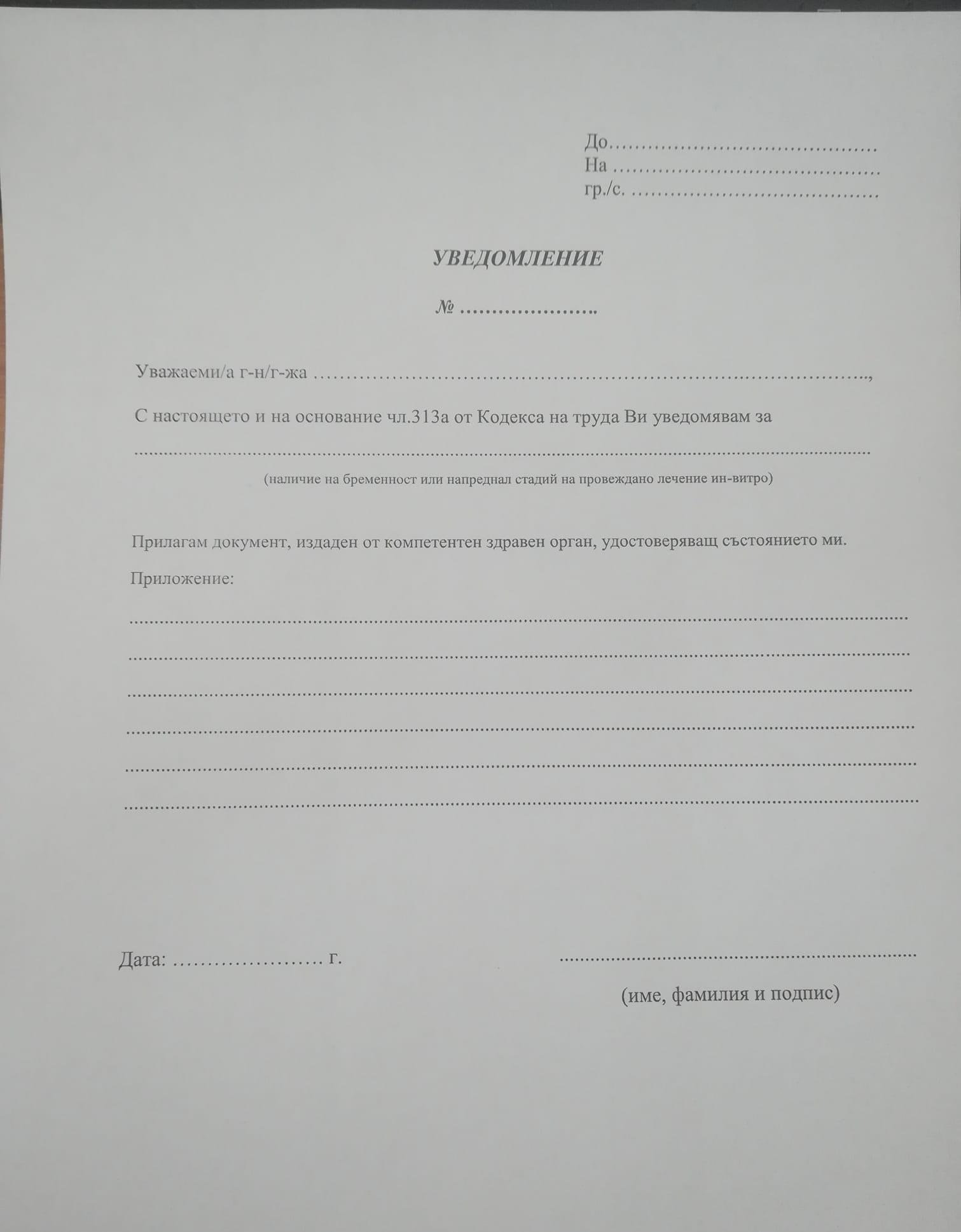 Няма нарочен формуляр. Работодателят може да се подпише на един екземляр, че е получил уведомлението.