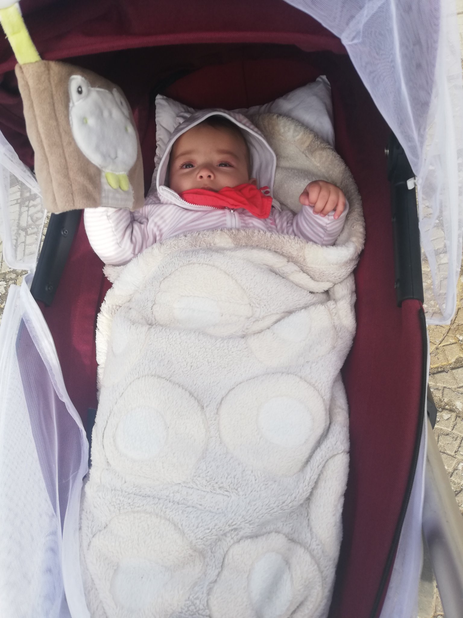 Нашия кош 6+ месеца е даже на село, трябва да го вземем. Но ние скоро не сме и излизали с количката. Днес времето е ужасно - студено, мъгливо и ръми.