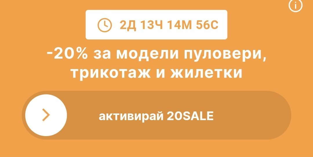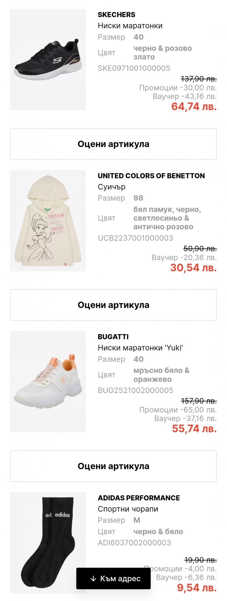 Моите неща също се бавят доста от 5 дни имам създадени товарителници, но уви......както изглежда доставките ще са следващата седмица, иначе докато се усетя докопах само код -35% и веднага поръчах едно преходно яке на Марикоо, много ми допадна и отново едни Скечъри на безсрамно ниска цена /36 лв/. Направих и втора поръчка имах код за -34 %, обаче нещо ми бъгна и поръчах само с - 20% няколко суичера, та сега чакам 2 пратки и двете се бавят.