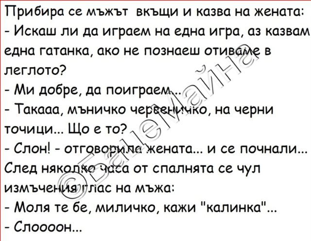 Прибрал се вълкът и заварил вълчицата да мие чиниите. Приближил се тихо отзад и я погалил по гърба. Тя зарязала миенето на секундата, извила се сладострастно назад и промъркала: