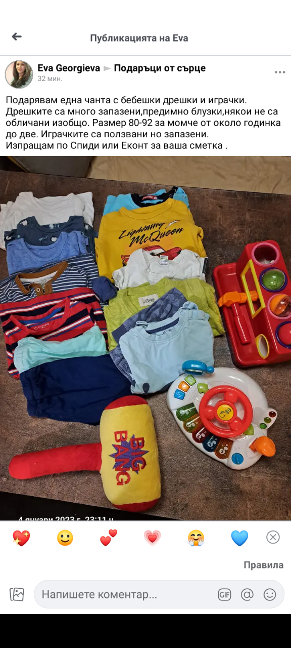 Да влезна в темата за детски дрехи. Аз така открих вторите употреби трябваха ми дрехи размер 40-44  см , едно боди ново този размер е в порядъка на 40-60 лв., и  една жена на улицата ме открехна къде мога да намеря за жълти стотинки. Та от 2018 г. досега си продължавам с купуванено на дрехи от ВУ яд ме за обувките,че вече рядко намирам в гр.София малки номера.