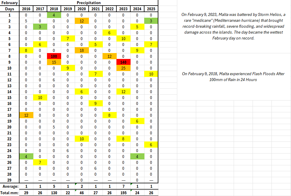 Ако идвате в Малта през февруари, просто имайте едно наум за дъждовете. Обикновено началото и средата на месеца са най-мокри. Повечето валежи са по-скоро кратки или леки, но проблемът е, че дори и така много често стават наводнения, защото канализацията им е под всякаква критика. Честно казано, такова нещо в България никога не съм виждала и само като се сетя, още ме побиват тръпки.