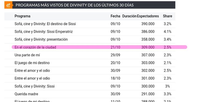 Само с 3 дни излъчване "В сърцето на града" ( Bu Şehir Arkandan Gelecek) е 4-тото най-гледано шоу по Divinity (Испания) за последните 30 дни.