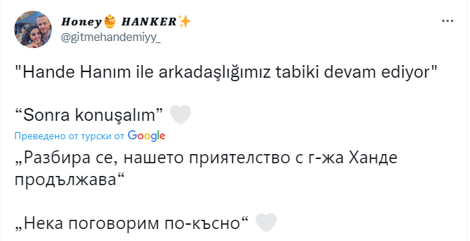 Единственото, за което трябва да се съжалява, е хейтът, който отнесе Ханде заради Каан. Но за жените винаги е било по-трудно. Те винаги отнасят повечето критики дори когато мъжете постъпват по същия начин. И двамата, Ханде и Керем, са личности с бурни емоции и това ги подведе. Но при тези обстоятелства не може да се говори за изневяра. Напротив - трябва да се продължи напред, защото те имат реалния шанс да започнат на чисто. Ако чувствата им са живи, ще се преборят за любовта си и ще преминат през това изпитание, за да прекарат този път живота си заедно.
