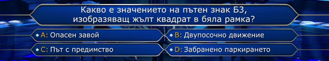 Ами... никой от въпросите не съответстваше на сумата. Особено този за 3000 съвсем ме сащиса! Отделно, че участникът започна да говори за "по-особените" знаци и каза, че били два - "обърнатият триъгълник" (но не спомена, че е №1) и вторият - този, за който се пита във въпроса. За "Стоп"-а - ни думичка.
