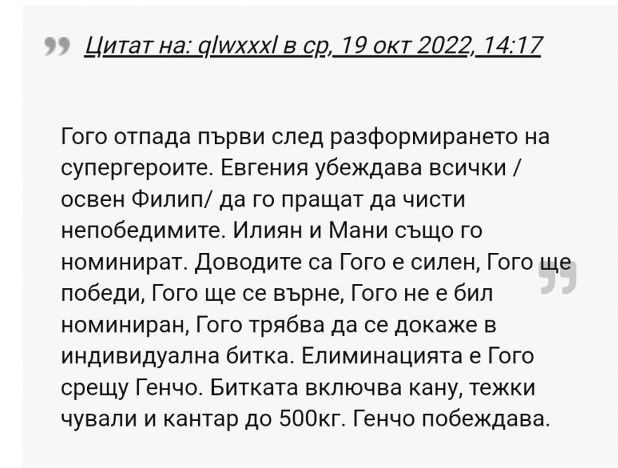 Няма ли един знаещ да пусне един нормален спойлер за тея игри бе. Гого до къде стига и от кой отпада!? Ако спойлер е верен, се надявам да го гледаме поне до средата на ноември... Поне..