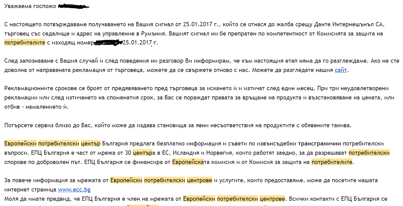 Започнах да ровя в старите имейли, за да си припомня сагата и какво точно ми бяха отговорили. Така... КЗП прехвърля жалбата към Европейски потребителски център в България, както писа Ивета, защото емаг е регистриран в Румъния.