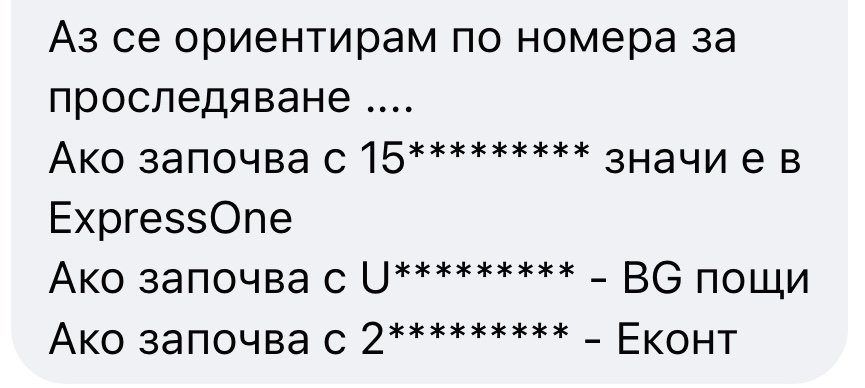 Е, проблеми не е имало и пратките винаги са пристигали точно там. Затова сега реших да попитам, защото не съм поръчвала отдавна и много неща са се променили. Относно проследяващия номер на пратката - въпросът ми по скоро беше как да разбера с какво ще пристигне. Не знаех, че може да се разбере по първите цифри/букви на самият номер.