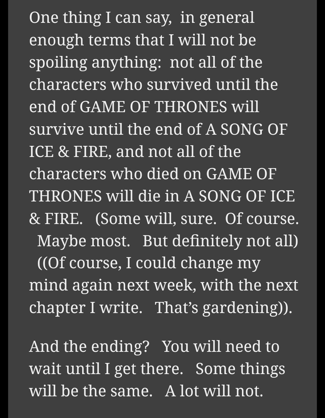 Аз не знам защо всички чакат толкова книгите на Мартин като спасение на поредицата. Факт е, че последният сезон беше адски претупан - особено Денерис, която за 1 епизод превключи и опожари чертога или как Джон научи истината за себе си и как неемоционално я прие, но според мен основните събития ще са същите - съдбите на героите, кой жив, кой умрял, кой ще седне на трона. Предполагам, че доста по-увлекателно и подробно ще се разкаже историята на Бран, Регар и Лияна и Джон и преходът при Денерис как губи контрола, но реално повечето фенове според мен останаха разочаровани от факта, че Бран стана крал, че Джон уби Денерис и отиде на вала, че Тирелите останаха без наследници, а това ще бъде същото в книгите.