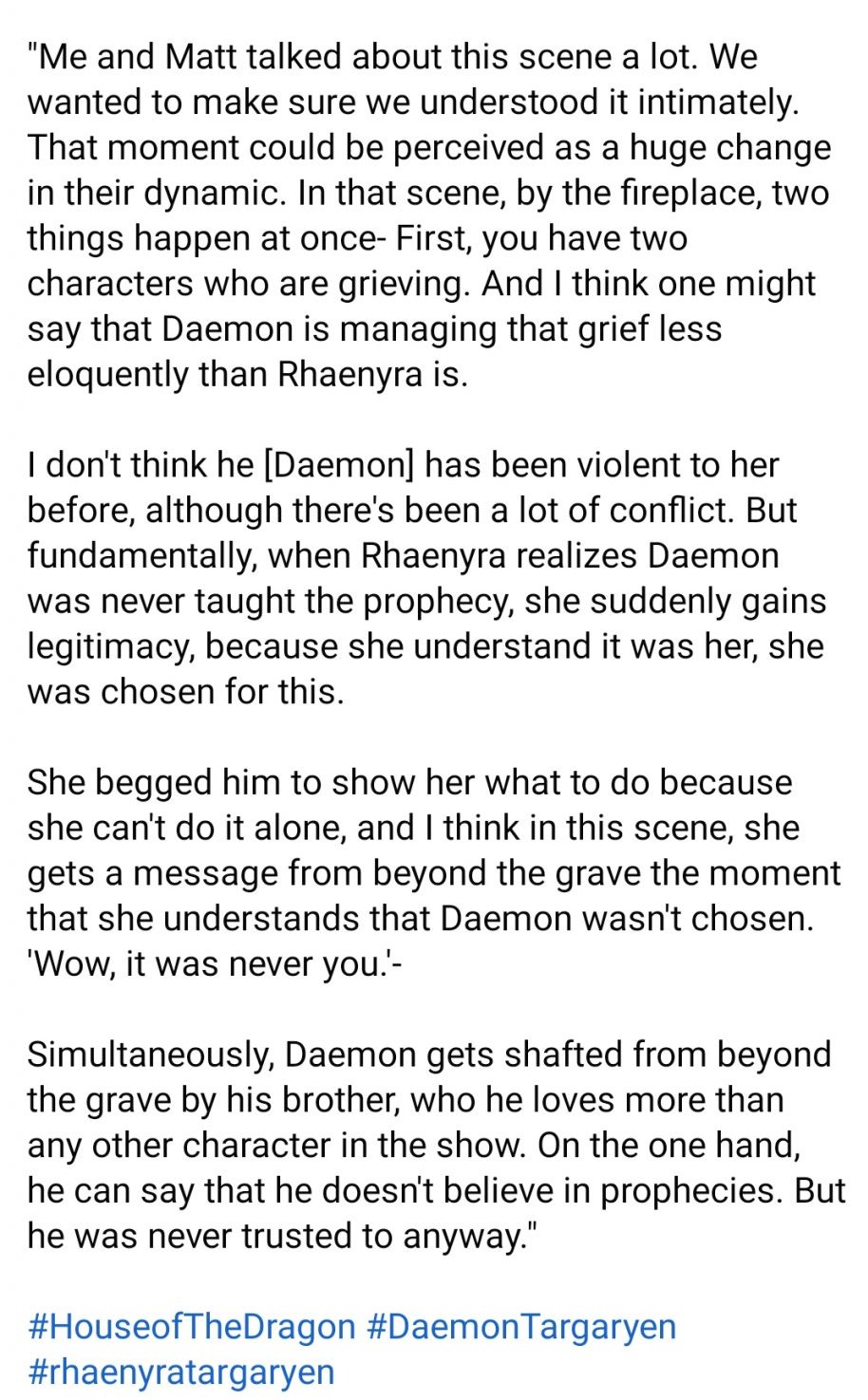 има теории, че са влюбени с Хелена и децата са негови. Доста показаха в тази посока и в сериала. А и така се удря директно по Алисънт и Ото. Да не говорим, че всички знаят със сигурност, че не трябва да излизат на пътя на Демън, който не е точно добър съпруг, а е жесток войн с безкрайно много контакти и слава.