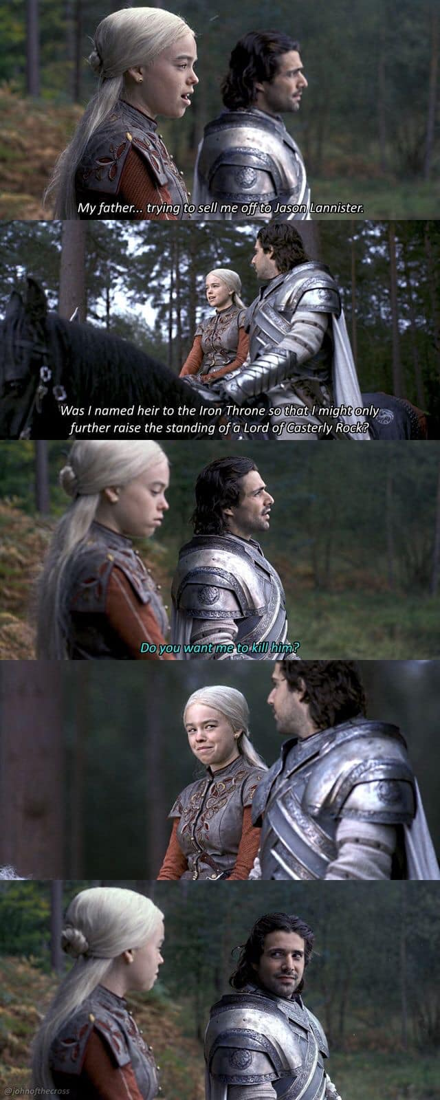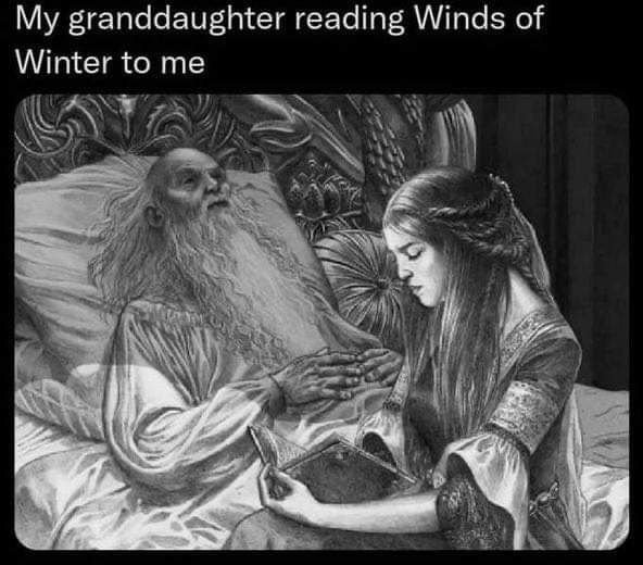 Реално това е бъдещата кралица Алисент, четяща на стария крал Джеерис (таткото на Визерис). Илюстрацията е от Огън и Кръв.