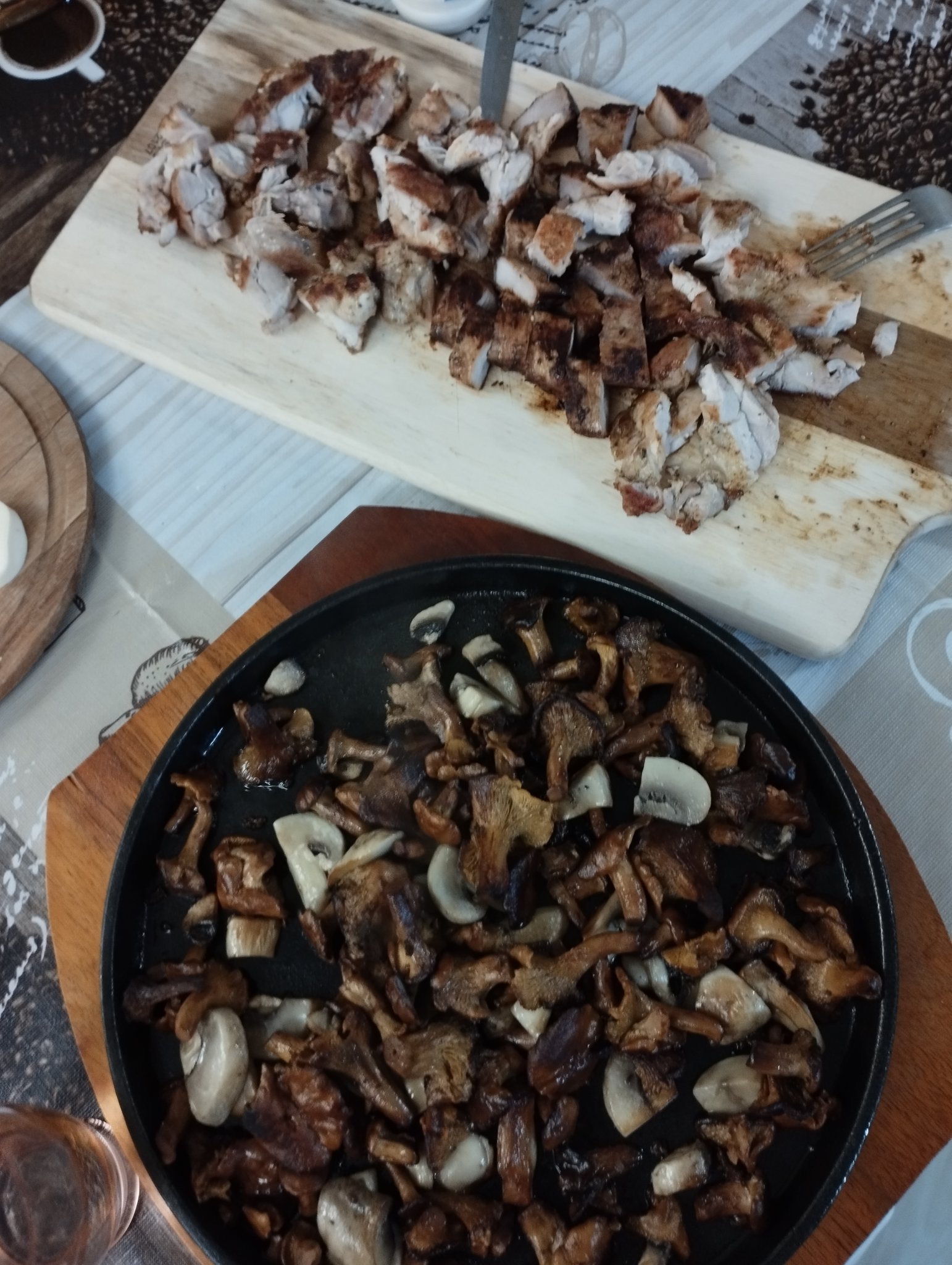 Днес половинът се погрижи за вечерята. Пържоли от бут + гъби в масло на сач, лично набрани от него 😁