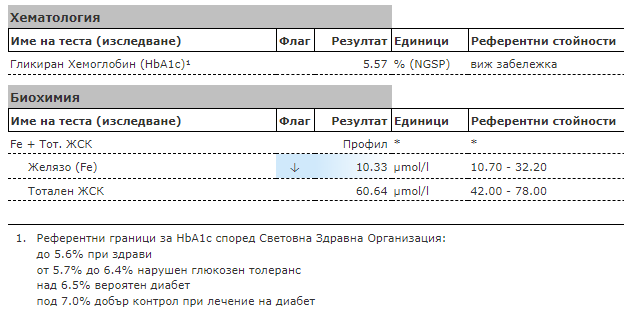 Гликираният ме изненада, защото сутрин КЗ е все над 6, а през деня пада до 5,3. Ако гледам него не съм в преддиабет. Тя беше казала, че щом хемоглобинът е добре, то и В12 и Fe са добре, но излезе друго.