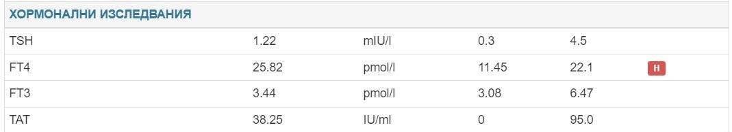 Вчера ходих в Цибалаб и пуснах хормони, сега FT4 е в рамките на референтните стойности, но се чудя TSH дали пък не ми е ниско. Той ми каза ако нещо ме притеснява, да си запиша час и да видим, ако ли не отново септември за годишен. Та това ми е чуденката, ако някой повече разбира и да си каже мнението. Ако ли не, ще ходя отново на преглед, а точно преди празниците е малко трудно да го хвана. Слагам в скрит текст старото изследване от септември и новото от вчера: