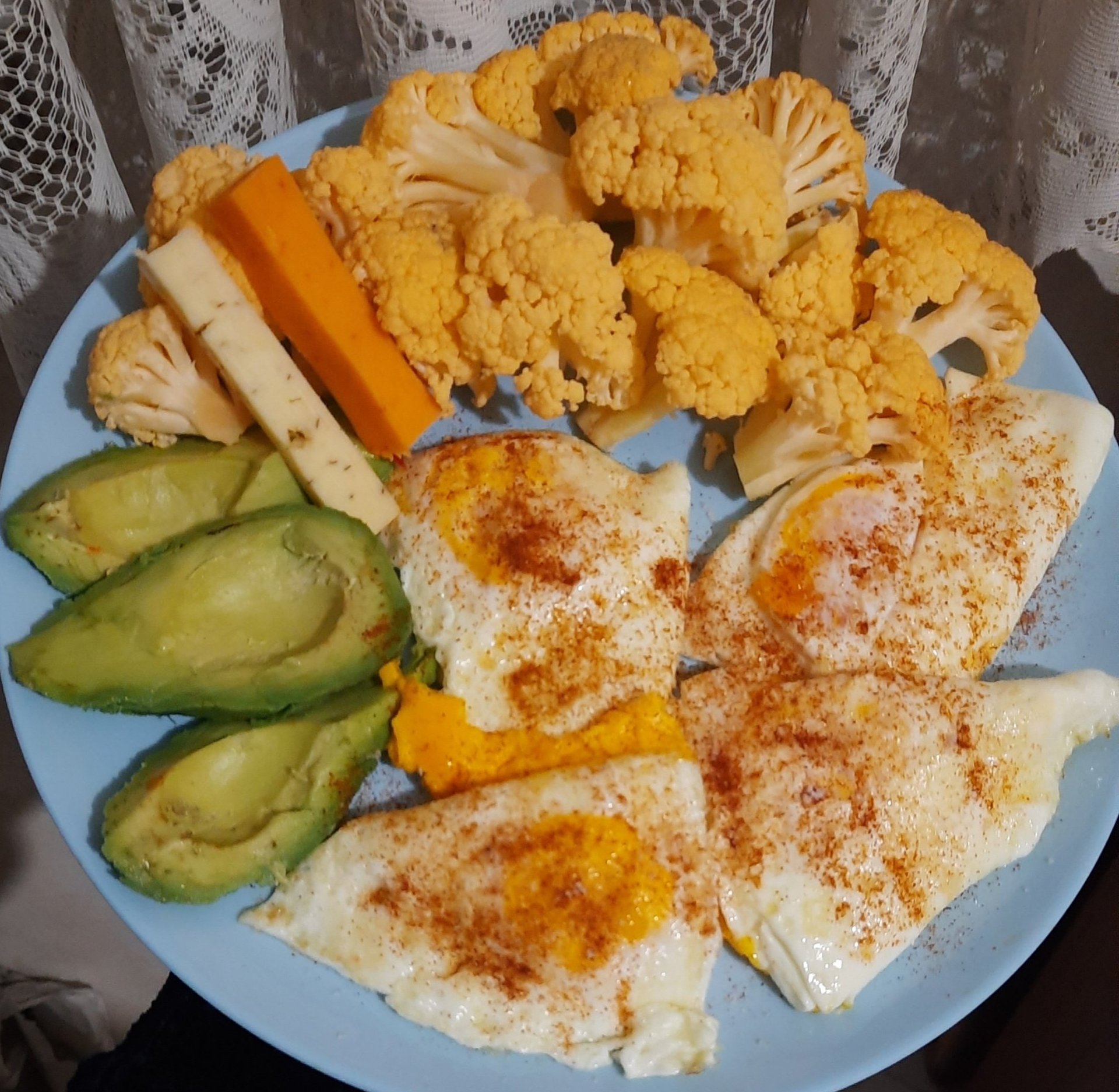 Моята вечеря е 4 яйца с полутечни жълтъци в зехтин и с лют пипер, 1 малко авокадо (от най-малките), гурме сирена в още по-гурме количество😁- сирене Брускета с домати и подправки и Оранжево песто с чушки и чесън, суров оранжев карфиол: