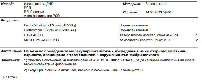 Какви генетични изследвания се извършват за тромбофилия и какви са резултатите от тези изследвания?