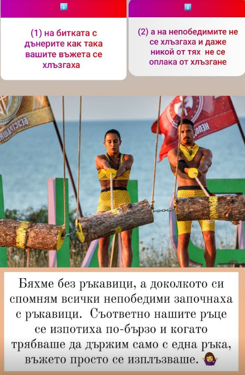 Защо след като те номинираха, не помисли с Рали и Мани да саботирате втората номинационна игра и на новия съвет да номинирате Джаферович с помощта на Мани, капитанския глас, грошовете и дори сабите на Ралица? Джаферович е контузена и ще я биеш лесно и се връщаш с грошове и си разбила основната коалиция в Безстрашните.