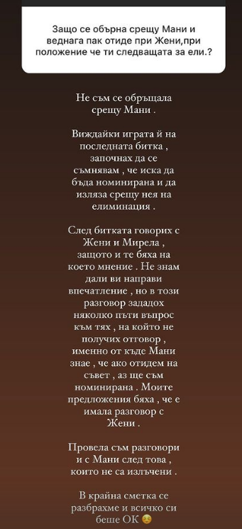 Доколкото разбрах от това, което Мишето каза в Надкаст Мирела е говорила неща за хора близки до Мишето в реалния живот. Забъркала е гаджето и и други близки в някакви сплетни, като оръжие в играта ги е използвала. Това е подпалило Михаела.