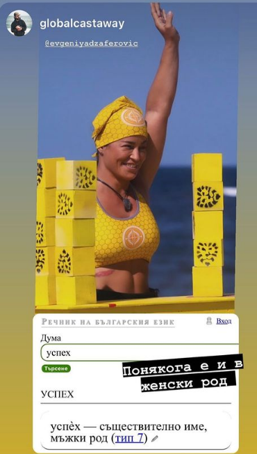 Хахаха тъкмо това си мислех вчера, ама не посмях изобщо да я спомена, защотооо тя е вторият човек, който ме дразни. Жени е първият, в началото я харесвах, силна е в игрите, подготвена, водеше отбора, после изведнъж много неща започнаха да излизат наяве, злоба към Фифо, изпадане в някви кризи като не стане, както е казала тя. Разбирам, че много хора й се радват на стратегиите, амааа да бяха правени с някакво достойнство. Тя определено прекалява. И между другото като даваха откъси от предаването в чакалкаста, точно, когато даваха нея и как се кара с Михаела, си казах: каква актриса само! Така изкара нещата накрая, че е най-обидената, най-недооценена, само тя е права и никой друг, дори почти не наде дума на Михаела, с такова високомерие води повечето разговори със съотборниците си, че... Успяла е в живота-чудесно, хубаво семейство-най-прекрасното нещо на света, кариера, няколко бизнеса... Трябва да е един щастлив, жизнерадостен, съпричастен, горд и достоен човек, с нещата, които притежава (затова имах големи надеждни за нея, че ще ми е фаворит, ще бие в игрите) а показа абсолютна противоположност: високомерие, злоба, подлост, но пък добра актьорска игра. 😃