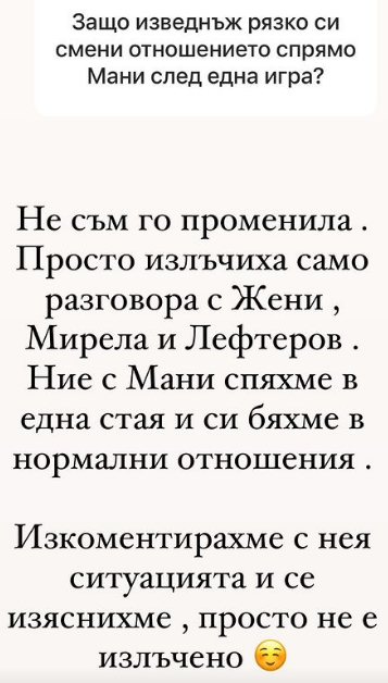 Сега гледах Михаела при Чакала, харесвам я, даде ми отговори на някои въпроси. А някой знае ли, какъв всъщност е бил проблемът между нея и Мирела, че не е говорила няколко дни с нея и с Жени? Много странно говорят за това и с някакви недомлъвки, някакви външни хора за нея, изобщо не ми стана ясно. Филип беше споменал нещо на Чакала, че Михаела харесала Лефтеров, а в крайна сметка май няма нищо такова 🤨