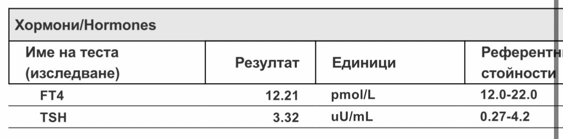 Здравейте, на 35 съм, с две успешни бременности на ниска доза еутирокс. В момента не пия, но рутинно проверявам хормоните. Това са последните (само забравих ФТ3 да пусна), не ми харесаха и днес посетих специалист: