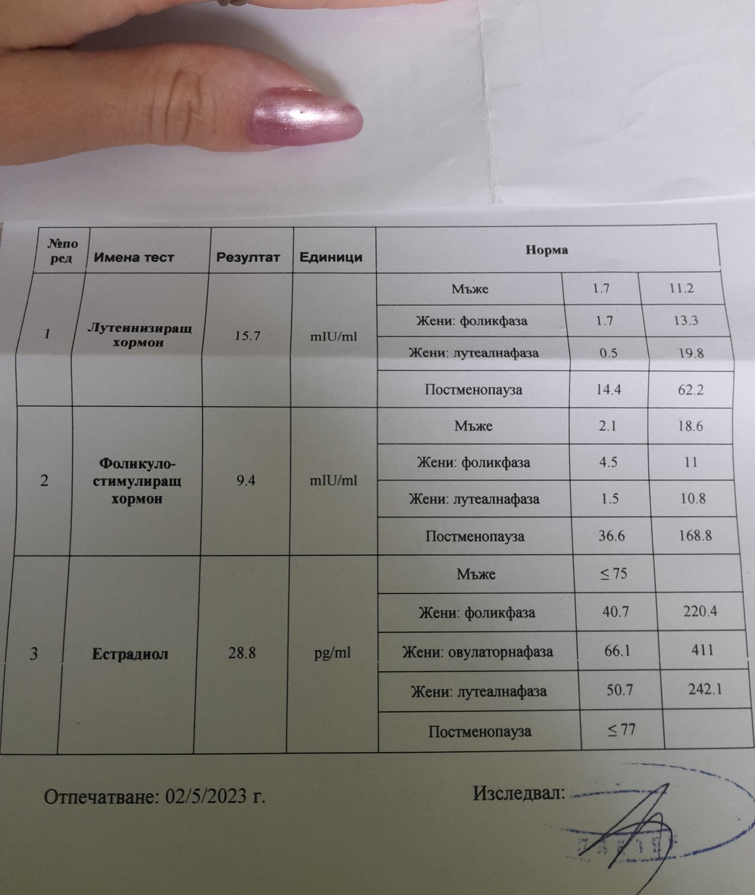 Здравейте! Трябва ми помощ за разчитането. Ще правя и още изследвания ,прегледа ми ще е чак към края на месеца , а това е и причината да питам тук. Правени са на 3-ти ден от цикъла,аз се опитах да си ги разчета и по моя преценка FSH ми е в норма, Лутеинизиращ хормон - леко над норма , а Естрадиол - под норма. Не знам дали правилно съм си ги разчела и за справка ги пускам и тук. Благодаря предварително!