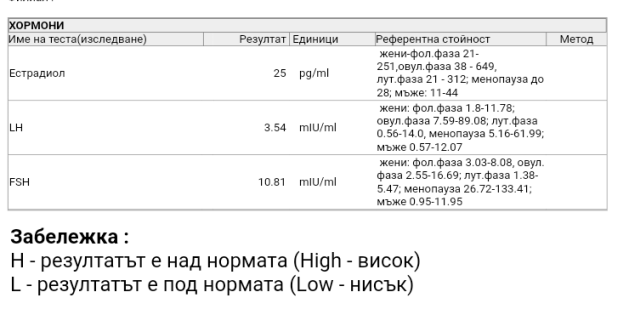 Излязоха FSH - 2.55 /гр: 3.5-12.5/, Prolactin - 571 /гр.: 101.76- 489/ и Естрадиол - 1621 /гр.: 114-332/.