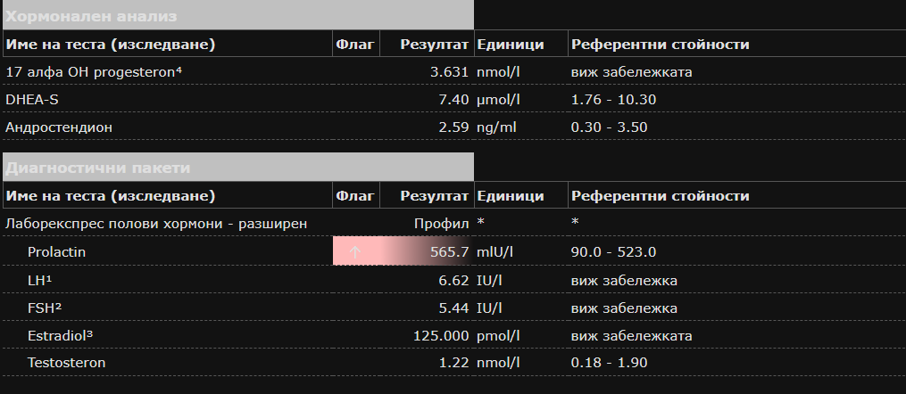 Препоръчително е да се направи повторно изследване на пролактина сутрин, след като сте гладували поне 8 часа. За витамините се препоръчва приемът на витамин D (6000-7000 IU/ден за поне 2 месеца) и витамин B12 (1000 mcg/ден за 2 месеца), последвани от контролни изследвания. Преди консултация с гинеколог не са необходими допълнителни изследвания, освен повторното изследване на пролактина сутрин след гладуване поне 8 часа.