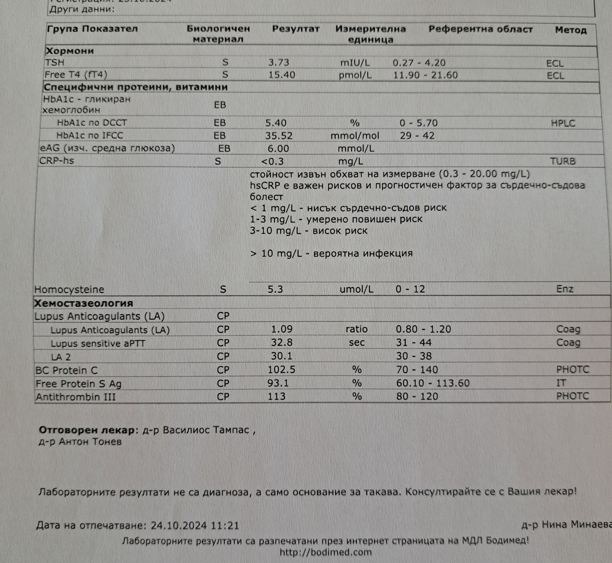 Привет! Може ли да помоля за коментар на тези изследвания? Правени са на чист ден от цикъла, сутрин, на гладно, без прием на кафе и Еутирокс (приемам по 25 микрограма, но като гледам май ще трябва да го увелича, защото целта е бременност и вероятно около или след Нова година ще стартираме поредния ин-витро опит, по мъжки фактор сме уж). Предстои ми офис хистероскопия за изключване на причина за липса на имплантация от последните трансфери.....Благодаря предварително! 🙏🌷❤️