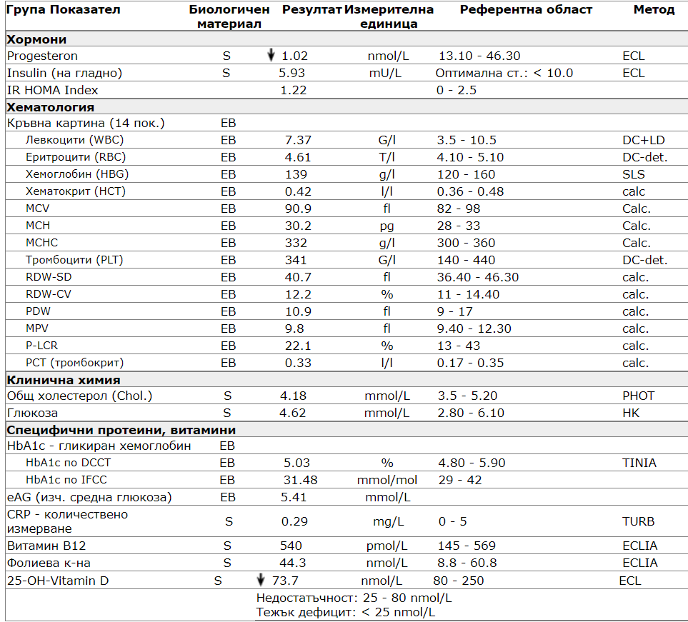След оскъден цикъл в два поредни месеца и след спонтанен аборт в 9 ГС през март съм. АГ ме насочи за изследване на прогестерон (21 ден от МЦ) и Естрадиол, ЛХ, ФСХ, АМХ, Тестостерон и Пролактин на 3ти ден от МЦ.