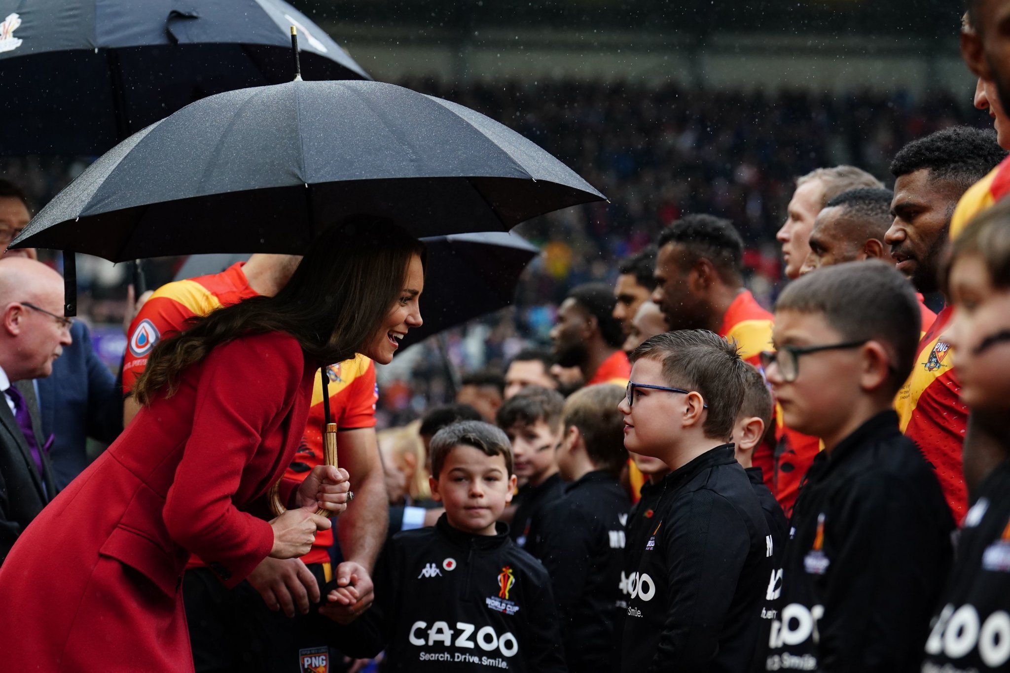 Принцесата на Уелс на терена на DW Stadium като почетен гост на четвъртфинала на Световното първенство на Англия срещу Папуа Нова Гвинея.