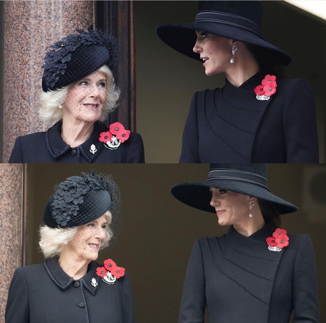 Каква изненада, Кей с рокля/ палто😂, но този път ми харесва.Горната част е интересна. Шапката, ако беше по-малка, според мен щеше да е по-добре. Шапката на Камила е грозна.