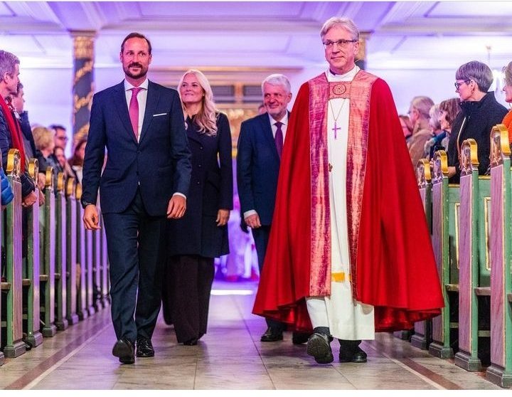 Мете и Хокон на служба в катедралата в Осло, за да отбележат годишнината на спешната помощ към църквата.