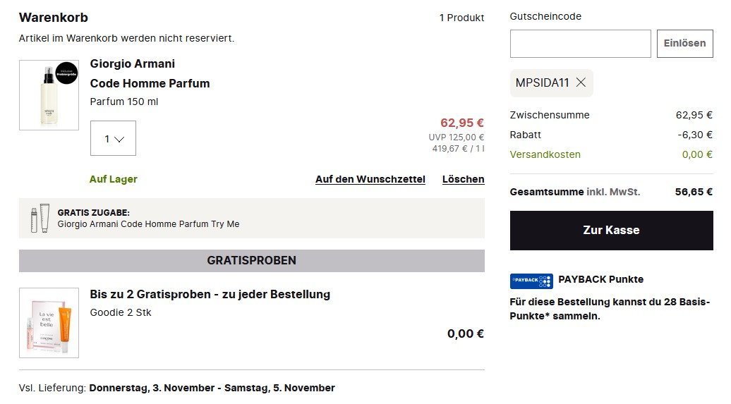 Armani Code Parfum 150 ml пълнител - 56.65 евро с код MPSIDA11 плюс две мостри подарък.