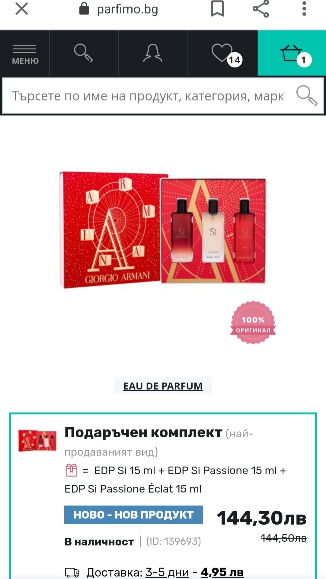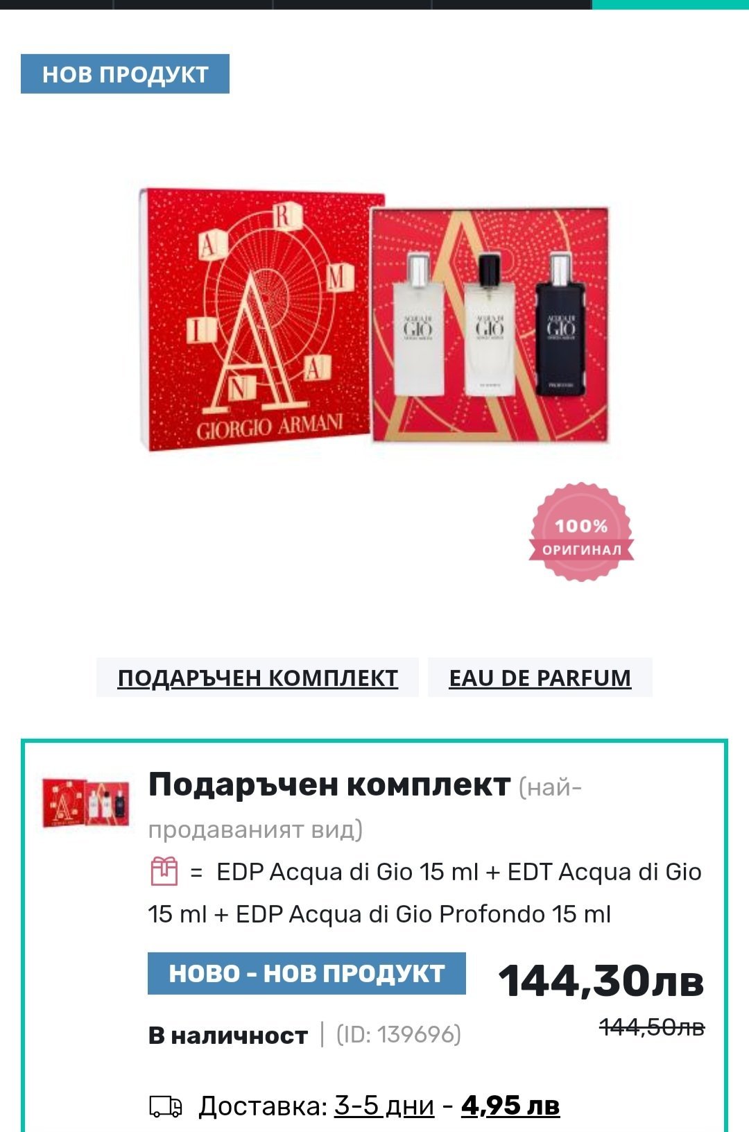 Парфимо са заредили сетовете на Армани , но цената е 144 лв. Hushed Hushed Тройна на цената в Нотино и Мейкъп. С доставката става 150 лв.Hushed