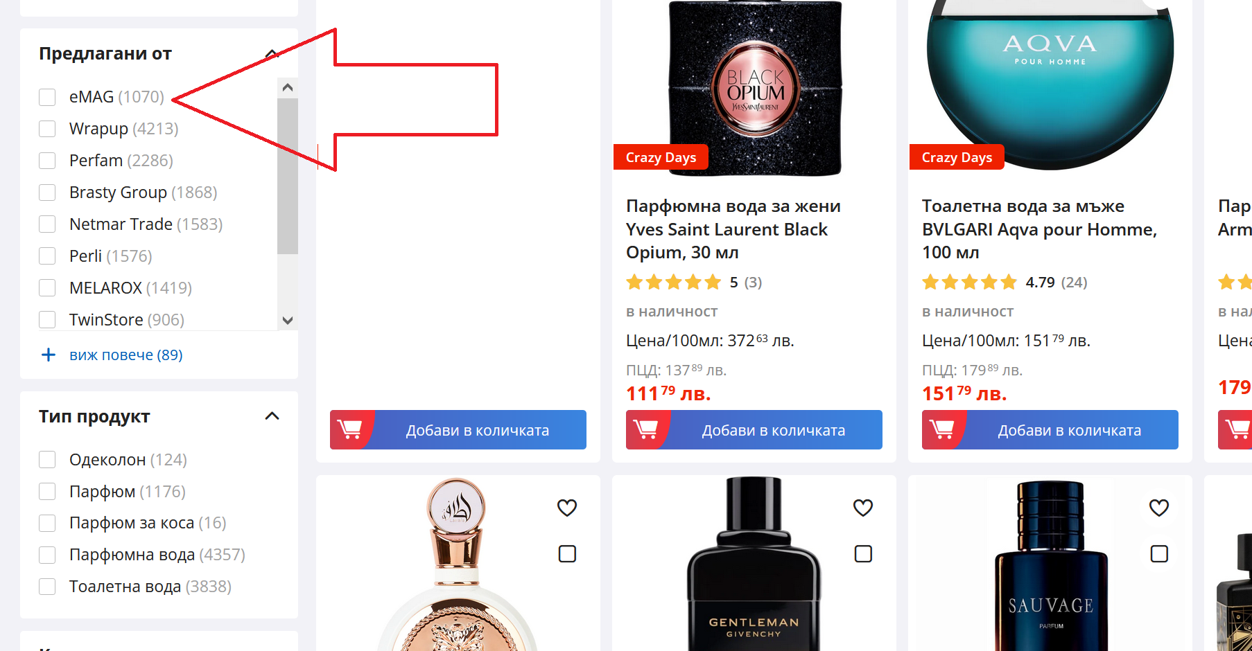 После, ако разгледате 1-ва страница на темата има доста от сайтовете, които присъстват в този филтър. Тоест, ако ги маркирате, имате по -голям шанс да намерите повече парфюмии, да сравните цените и т.н.