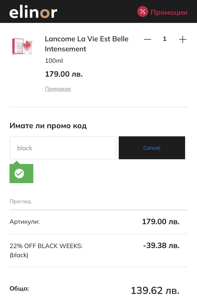 P.S. В Елинор с кода black цената за 100 мл е много по-добра 139,62 лв. :