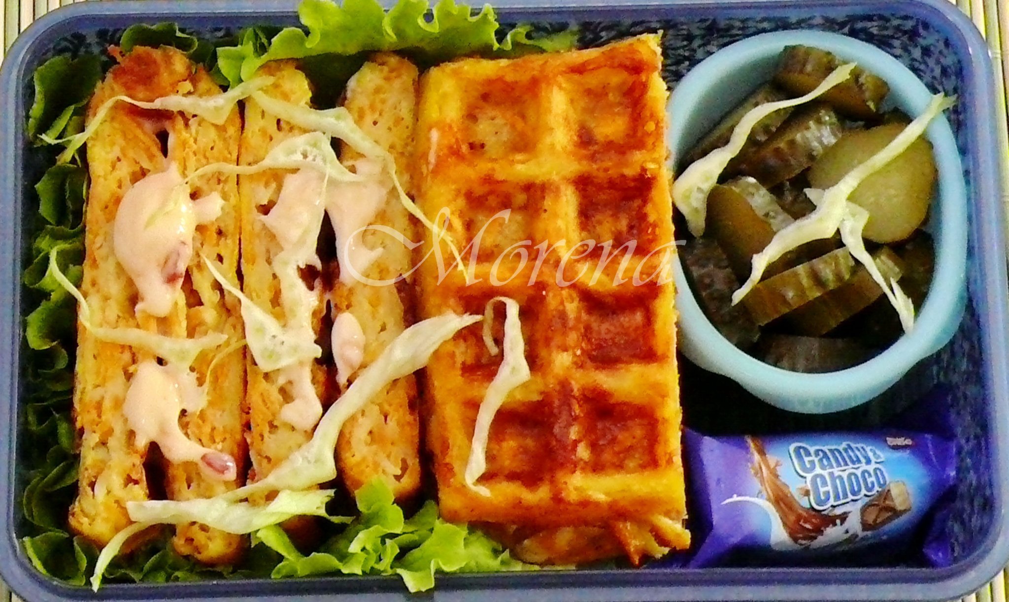 (обикновен и сладък картофи) и сирена (чедъра от 1кг, кашкафал Алфатар и крема сирене Пилос) с майонеза и сладък чили сос, кисели краставички и десертче - всичко от лидл, само гофретникът е от К.