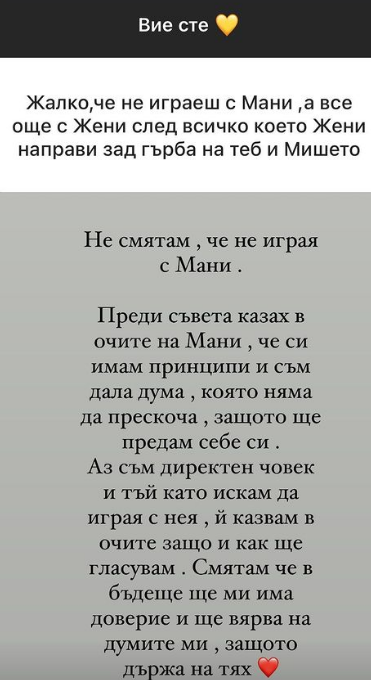 Този отговор на Ралица ми е чудно какво точно значи. От една страна в днешния епизод Филип ще говори с нея, като по този начин ще ѝ даде шанс да се съюзят срещу Джаферович, от друга страна може би има предвид, че ще си седи с Жени до последно. Все пак и двамата(Фифо и Жени) са от едно и също племе и реално Ралица, с който и да се съюзи, не предава племето си.