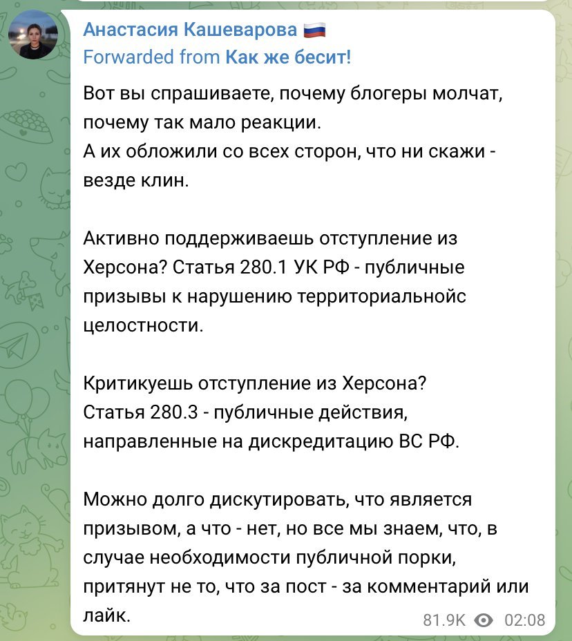 Другата е тоталната шизофрения, в която живеят руснаците - от една страна си мислят че живеят в правова държава, където хората имат право на мнение и да искат отчетност от властта, но от другата страна са неумолимите закони на матушката - ако призоваваш за изтегляне от Херсон си подсъдим по член 280.1 за публично призоваване за нарушаване териториалната цялост на империята, ако обаче критикуваш изтегленято, си подсъдим по член 280.3 за публично дискредитиране на военните и сили.