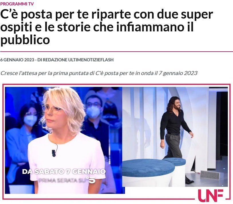 Дойде времето. C'è posta per te започва отново по Канал 5 с ново издание на програмата на Мария де Филипи. За публиката, която обича C'è posta per te, това е голям ден. На 7 януари 2023 г. ще бъде излъчен първият епизод от програмата на Канал 5, който ще разкаже много истории, както и първите очаквания.В социалните мрежи C'è posta per te бяха публикувани няколко клипа, показващи кратките моменти, които ще видим в програмата. Това са историите, които публиката харесва най-много: предателство, когато съпругата се опитва да се извини на съпруга си за това как връзката им е приключила. И тогава семейството се опитва да се извини на разочарованата си и изоставена дъщеря. И, разбира се, прекрасни гости: кой ще присъства в първия епизод на C'è posta per te? Мария де Филипи започва работата си с двама любими гости.