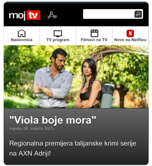 "Франческа Килеми, най-красивата италианка, и Джан Яман, сърцеразбивачът от Турция, са главните герои на криминалния сериал "Viola boje mora", който бие всички рекорди по гледаемост в Италия и чиято премиера стартира на 8 февруари по AXN Adrija"