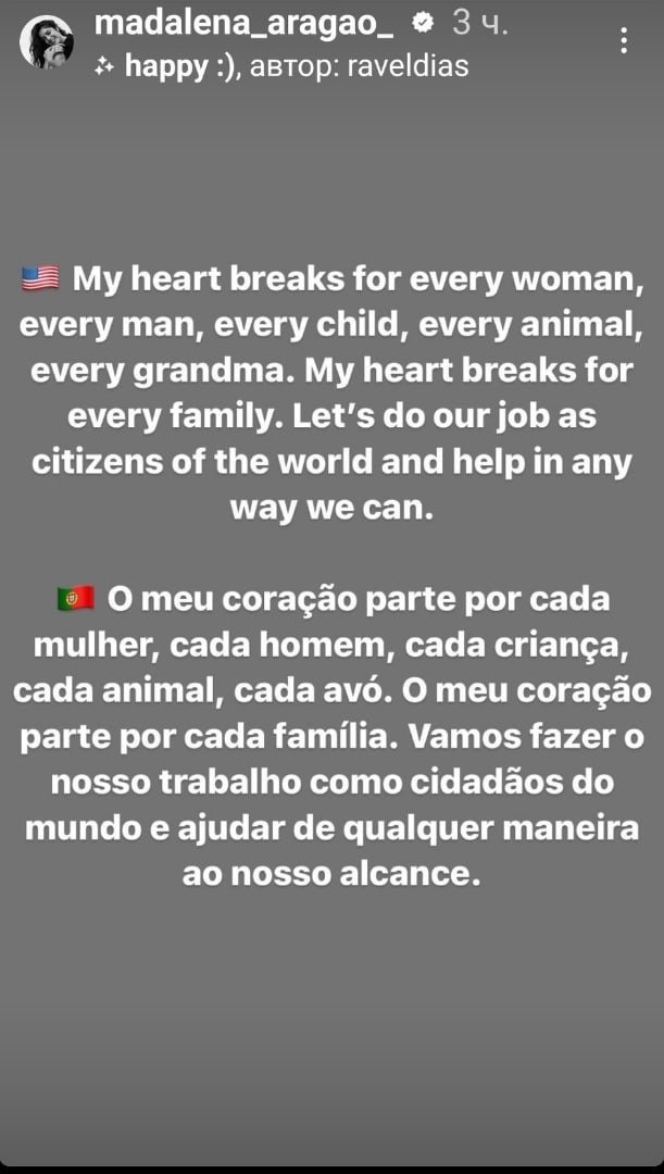 ✅IG Историята на Мадалена Арагао....Сърцето ми се къса за всяка жена, всеки мъж, всяко дете, всяко животно, всяка баба. Сърцето ми се къса за всяко семейство. Нека да си вършим работата като граждани на света и да помагаме с каквото можем.