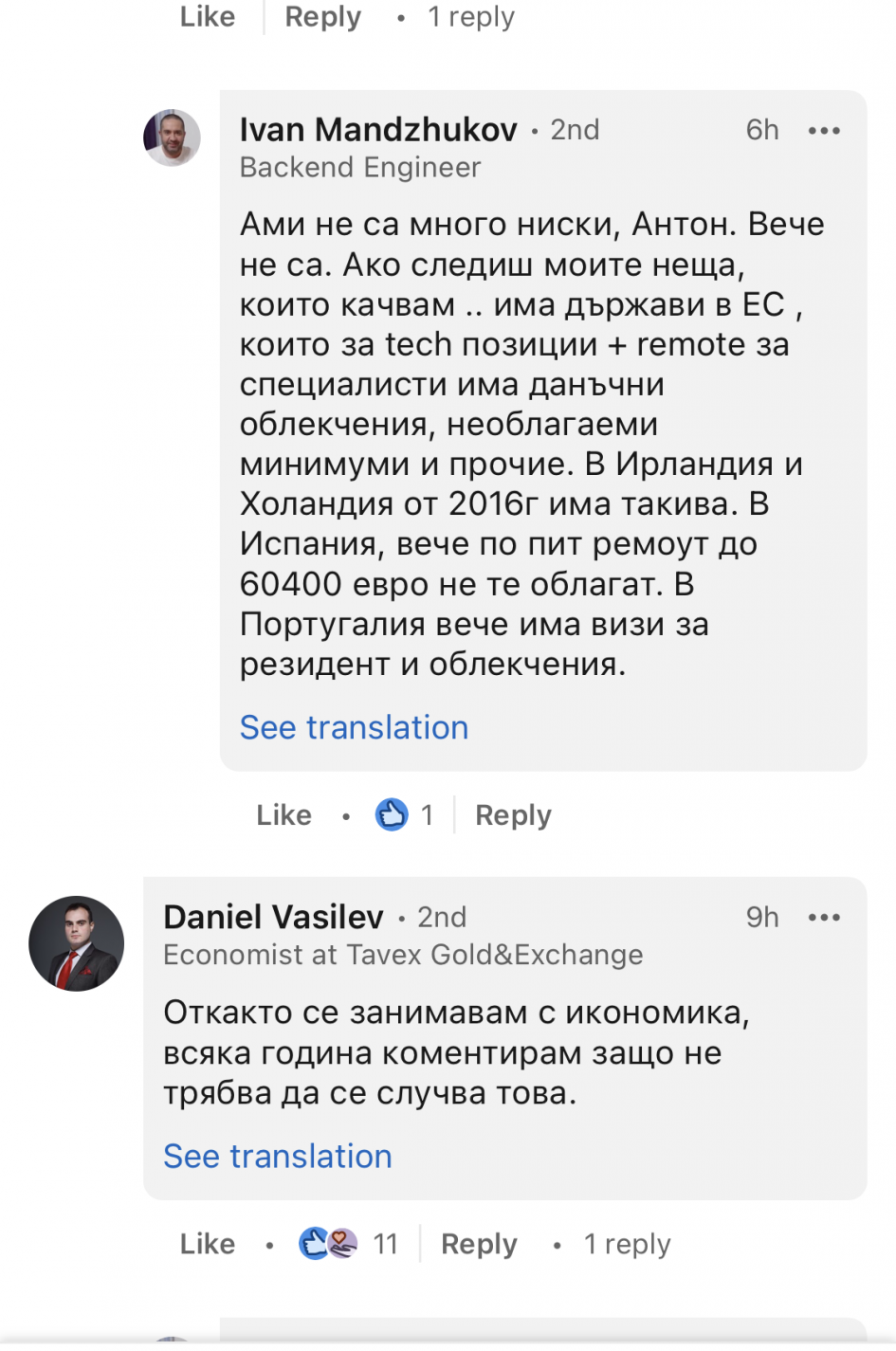 Не знам кой на кого завижда, ама често чета възмущение как едни плащали много, пък получавали насреща колкото ония дето плащали малко. Сега, възмущение ли е, завист ли е, не се наемам да гадая. Но не мисля, че някой мрази хората с високи доходи. Свалете ги малко тия носове. 4к за Европа може и да са нищо 2022 г /съгласна съм/, ама колко хора ги взимат? И недейте пак за кадърността и мързела, че става смешно вече. И друг път съм писала, излезте от София и ще изпаднете в шок какъв е пазарът на труда извън нея. Такава заплата за много кадърни, работливи и образовани хора все още е мираж. Но ситият на гладния не вярва, казали хората, та е малко спорно в чие око е гредата.