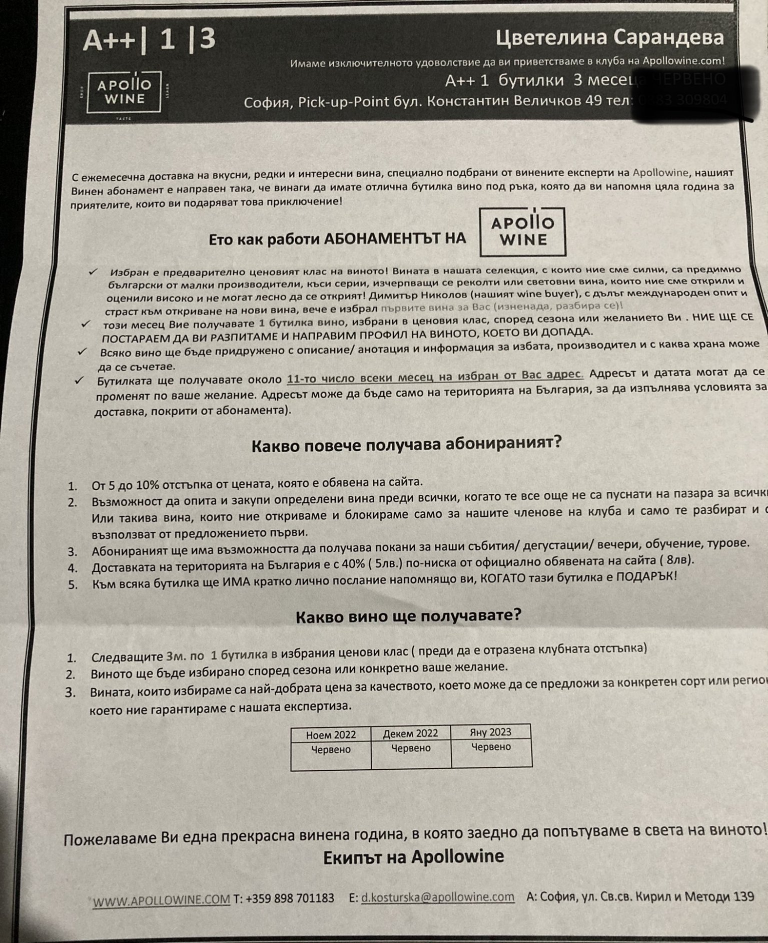 Взех си днес кутията с вино. Хубава идея, лошо изпълнение. Ще им дам обратна връзка и дано бързо си оправят нещата. При мен даже липсваше обещаната анотация. Дано е от вълнение, защото е първа кутия. Те всъщност още не били  отворили официално. Надявам се само при мен да са така неподготвени, защото вече ме гризе съвестта, че писах тук. Това взех. Кутия от тънък картон, без нищо вътре освен снимания лист. В който дори има описана доставка, която уж нямаше. Другите кутии са ме разглезили 😃 Иначе виното изглежда добре.