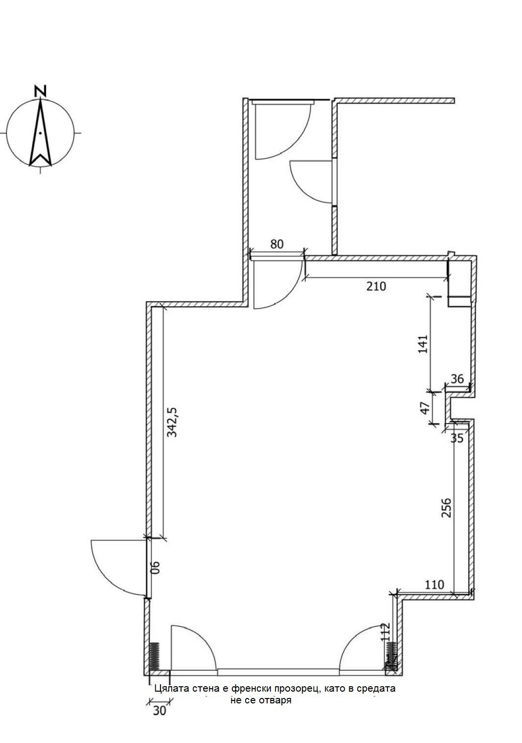 Не са дадени всички размери, но стаята е макс 24-5 кв. Ако трябва да има кухня, трапезна маса и диван с телевизор, не виждам как ще остане място за гледка.