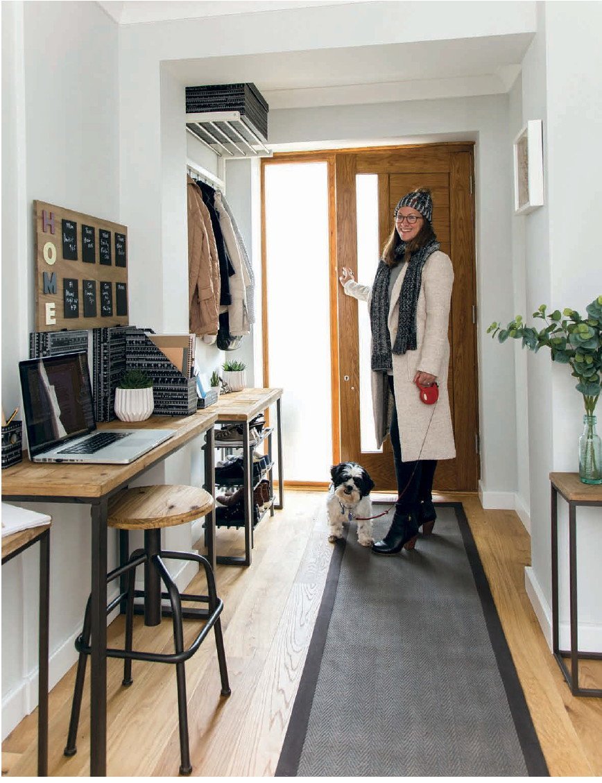 Бих преградила коридора около мястото с бюрото..., и етажерките могат да се използват за съхранение, може и с гардероб или портманто.