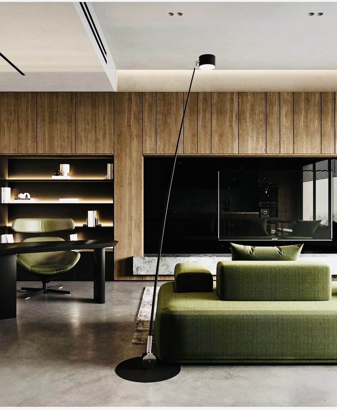 По същество, относно откритите уреди - предлагам да обмислите подвижен плътен сгъваем параван с височината на плота пред уредите и съответстващ на стила на цялото помещение. Може да е както изцяло дървен, така и комбинация между дърво и текстил, огледална повърхност, ажур - възможности има много, а кой ще се окаже най-подходящ, ще си излезе след останалото обзавеждане, включително текстила, дори може да повтаря текстил от завеси/щори. Няма да обезшуми при ползване, но пък естетически ще помогне.  Така няма да се налага да се прави остров, който вероятно пък ще попречи на трапезарната маса.
