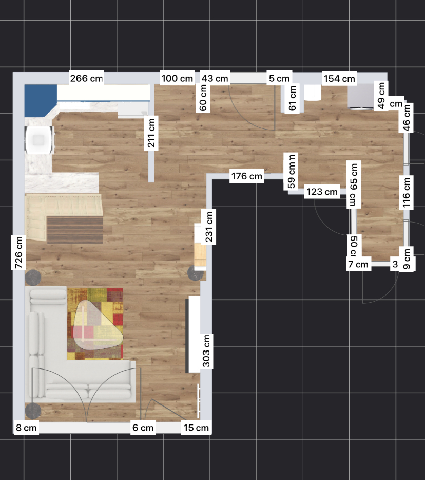 Как мога ефективно да разпределя 666 см пространство между диван, кухня, маса и столове?