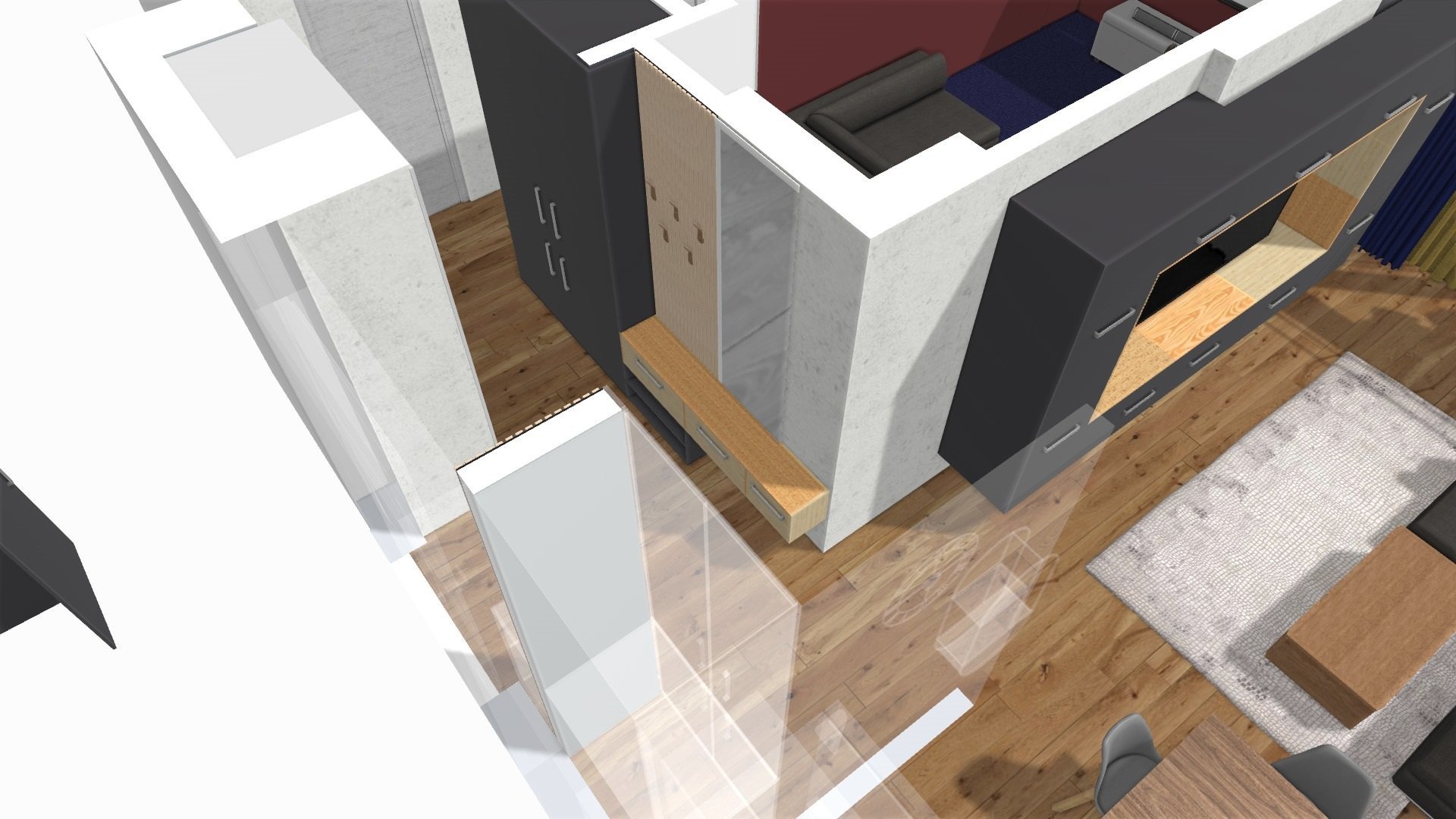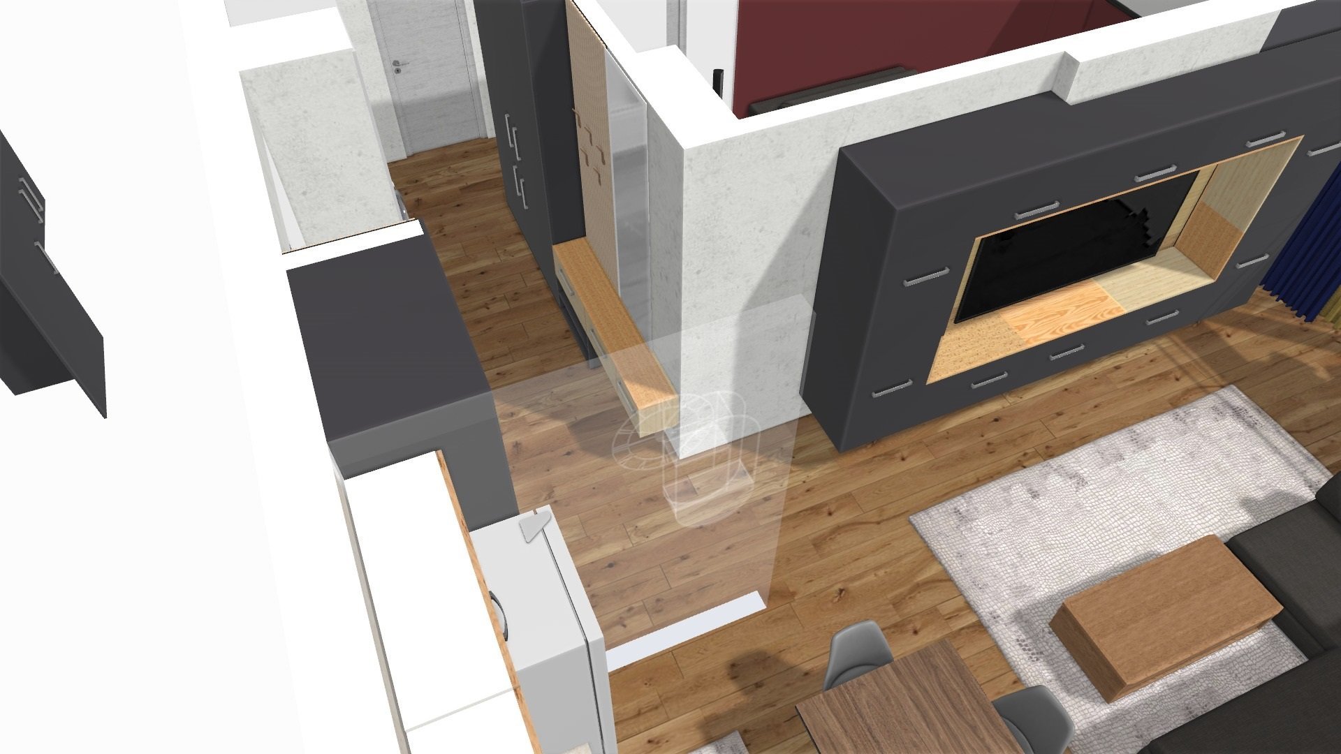 В червено е отбелязано разпорожението на кухнята, а в синьо-дивана. От тук нататък не зная какво да правя. Искаше ми се малко бар-плотче, понеже нямам никакви чекмеджета в шкафовете, заради пералнята и съдомиялнята. Отделно искам и трапезна маса.